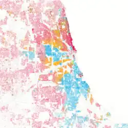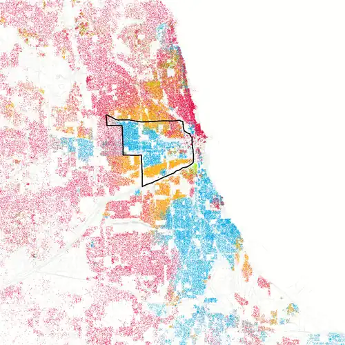 The West Side has gone through many transitions in its ethnic and socioeconomic makeup due to its historic role as a gateway for immigrants and migrants as well as its role for funneling poorer African-American residents away from the wealthier lakeside neighborhoods and central business district.[2] Historically the Great Chicago Fire of 1871 started on the West Side before consuming much of the then city, and Jane Addams of Hull House brought international attention to the West Side in the late 1900s and early 20th century. At the same time, some of Chicago's grandest parks and boulevards were laid out on the West Side. Today, the West Side consists of large mixed communities of middle class, working class, and low-income African American, Puerto Rican, and Mexican residents; some small communities of blue-collar, lower middle class and middle class white residents of historically Polish, Italian, Czech, Russian Jewish, and Greek, descent; and newer communities of middle-class, upper-middle class, and wealthy white residents created by gentrification.[3] Major shifts continue to happen due to forces such as rapid gentrification, selective corporate investments, and unequal distribution of city resources.[4][5]