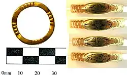 The hoard contains four gold finger-rings, a fragment of gold cloisonné jewellery, a piece of gold ingot, along with a lead spindle whorl.[4] The 2008 finds were found in three batches across two days and were a finger-ring set with a garnet, a finger-ring with an enlarged bezel, a finger-ring inlaid with niello, a partial gold ingot and a fragment of cloisonné.[5] The 2009 finds were a gold finger-ring with a round bezel, filigree and granulated decoration, as well as a lead disc, most likely a spindle whorl.[6]