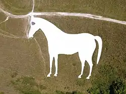 According to local tradition,[3] the current white horse was cut in 1778 by a Mr Gee, who overlaid a smaller, older chalk figure, believed to also have been a horse, the only surviving image of which dates to 1772, and shows a figure facing the other way with a long tail. During the 19th and early 20th Centuries the figure was periodically reshaped and repaired.[3]