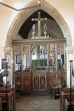 A west gallery was installed, presumably in the 18th century. In 1855–56 the gallery was removed and the church was restored under the direction of the Oxford Diocesan Architect G.E. Street,[2] who also added the battlements to the nave parapet. The then Vicar, Rev. E.L. Lockyer, painted the screen[4] and the decorated patterns on the chancel and aisle arches. The current rood cross is a 19th-century Gothic Revival addition.[6] St. Edward's is a Grade II* listed building.[4] In the churchyard just south of the church are a 15th-century tomb chest that has a quatrefoil at either end, and the base and steps of a late medieval stone cross.[2] The tower has three bells, which are notable for being moved by half-wheels.[6] The second bell was cast by John Mitchell of Wokingham[7] in about 1490.[8] Mears and Stainbank of the Whitechapel Bell Foundry cast the tenor and treble bells in 1904.[8] St Edward's also has a Sanctus bell that was cast by an unknown founder in about 1699.[8]