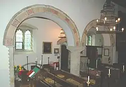 There is archaeological evidence that by at least the 11th century there was an Anglo-Saxon stone church at Westcott Barton, which was originally dedicated to St Edmund the Martyr. In the 11th century the nave was extended westwards and in about the middle of the 12th century the south aisle was added. It has a two-bay arcade and a tomb recess,[2] both of which are Norman.[3] The chancel arch is in a transitional style from Norman to Early English.[4] The church's dedication was changed from St Edmund to St Edward the Confessor in 1238.[5] In the 14th and 15th centuries the chancel and north wall of the nave were rebuilt, the west tower and battlemented south porch were built[2] and the wooden rood screen was installed, all in Perpendicular Gothic style.[3] However, in about 1520 the chancel was reported to be in ruins.[2]