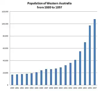 The population in Western Australia in 1891 was 49,782. By 1895 it had doubled to 100,515, and by 1901 was 184,124.[2]