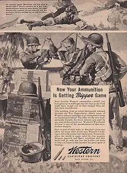 John Olin, the son of founder Franklin W. Olin, improved shotgun cartridge designs in the 1920s by using harder shot and progressive burning powder.[9] Western produced 3 billion rounds of ammunition in World War II, and the Winchester subsidiary developed the U.S. M1 carbine and produced the carbine and the M1 rifle during the war. Western ranked 35th among United States corporations in the value of wartime production contracts.[10] Cartridges made by Western are stamped WCC. Western Cartridge Company produced the now collectible "Western Xpert" brand of shotgun shells in both 12 and 16 gauge sizes.