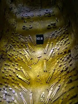 With the exception of Baling, all of the Western Han dynasty imperial tombs follow a consistent architectural pattern that is basically inspired by the mausoleum of Qin Shi Huangdi (died 210 BC).[4] The emperor's burial chamber is covered with a large square or rectangular truncated packed earth pyramid with a flat plateau as the top surface. The sides of the base are usually 150 to 170 meters and the height 20 to 30 meters. Maoling is distinguished by being significantly larger. Some of the graves are designed with a two-step top toe.[2] The tombs contain several decorated chambers containing grave goods, and the burial grounds have ritual architectural features such as processional routes and gates.[5]