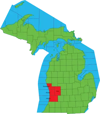 In general, "West Michigan" often refers to the area bounded by the cities of Muskegon (in the north), Grand Rapids (in the northeast), Kalamazoo–Battle Creek (in the southeast) and St. Joseph–Benton Harbor (in the southwest). However, definitions of the boundaries of the region vary widely; in some contexts, the term "West Michigan" is applied only to the counties of Allegan, Kent, Muskegon, and Ottawa, which form the core of the Grand Rapids-Kentwood-Muskegon CSA. Other definitions include the Kalamazoo–Battle Creek and Benton Harbor–St. Joseph regions, which can be considered distinct regions or parts of other regions such as Michiana, Southern Michigan, or Southwest Michigan,[1][2][3] the latter according to one definition comprising Berrien County, Cass County, and Van Buren County.[4]