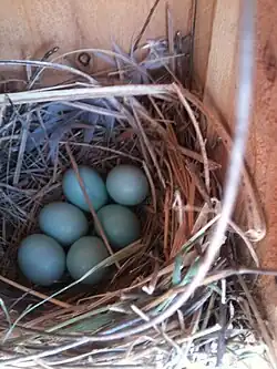 The western bluebird nests in cavities or in nest boxes, competing with tree swallows, house sparrows, and European starlings for natural nesting locations. Because of the high level of competition, house sparrows often attack western bluebirds for their nests. The attacks are made both in groups or alone. Attacks by starlings can be reduced if the nesting box opening is kept to 1.5 in (38 mm) diameter to avoid takeover. Nest boxes come into effect when the species is limited and dying out due to the following predators: cats, raccoons, opossums, and select birds of prey such as the Cooper's hawk. Ants, bees, earwigs, and wasps can crawl into the nesting boxes and damage the newborns.[5] Western bluebirds are among the birds that nest in cavities, or holes in trees, or nest boxes. Their beaks are too weak and small to dig out their own holes, so they rely on woodpeckers to make their nest sites for them.[5]
