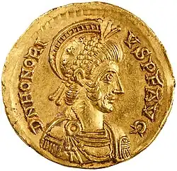 Honorius, the younger son of Theodosius I, was declared Augustus (and as such co-emperor with his father) on 23 January in 393, at the age of 9. Upon the death of Theodosius, Honorius inherited the throne of the West at the age of ten whilst his older brother Arcadius inherited the East. The western capital was initially Mediolanum, as it had been during previous divisions, but it was moved to Ravenna in 401 upon the entry of the Visigothic king Alaric I into Italy. Ravenna, protected by abundant marshes and strong fortifications, was far easier to defend and had easy access to the imperial fleet of the Eastern Empire but made it more difficult for the Roman military to defend the central parts of Italy from regular barbarian incursions.[51] Ravenna would remain the western capital until 450 when Valentinian III moved the court back to Rome. Most western emperors from 450 until 475 reigned from Rome. The last de facto western emperor Romulus Augustulus resided in Ravenna from 475 until his deposition in 476 and Ravenna would later be the capital of both the Ostrogothic Kingdom and the Exarchate of Ravenna.[52][53]