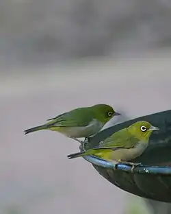 The upperparts are entirely bright olive-green, with the wings and tail feathers grey, edged with green. The throat and undertail coverts are yellow-green, with the rest of the underparts grey. Circlets of small white feathers surround the eyes. Males are brighter yellow on the throat than females. The birds are 10–13 cm in length and weigh about 10 g.[1][2] They give a variety of high-pitched calls, with the distinctive and constantly uttered contact call a thin ‘psee’.[3]