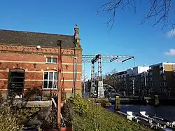 The south-eastern entrance over the Haarlemmervaart consists of a drawbridge that dates back to 1919. Originally situated on the Zijkanaal in Amsterdam-Noord, it was moved to its current location in 1956 to serve as an access bridge to the site of the Westergasfabriek.[1]