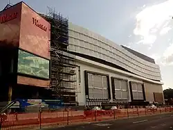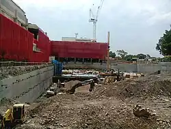 In early 2009, Sutherland Council approved plans to further upgrade the complex, which included demolition of the office tower and adding 100 additional speciality shops at a cost of $435 million. Myer lost its ground floor for a larger 'full-line' Woolworths supermarket.[18] The entrance has moved closer to the Kingsway and the centre expanded by approximately 19,000 square metres to 127,000 square metres of gross lettable area. Demolition of the areas around the office tower began in July 2013.[19] The star which sat on top of the tower was knocked off in late July 2013 as the office tower it sat upon was demolished. This caused anger amongst locals who wanted the star saved and incorporated into the new development.[20][21][18] However the fig tree located outside the centre on Kingsway was saved and incorporated into the development, with a team of landscape architects and arborists managing the health and habit of the tree.[12] This development did feature a new facade above the centre which is made up of grey wall which is designed to resemble fish scales in homage to "the Sutherland Shire's beach culture".[22]