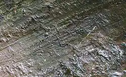 The rock and carving are first mentioned in print in an 1873 edition of the "Gazetteer of Massachusetts" and was described as "There upon its face a rude figure, supposed to have been cut by some Indian Artist."[1] In an 1883 town history, the carving is described as "A broad ledge which crops out near the house of William Kitteredge has upon its surface grooves made by glaciers. Rude outlines of the human face have been traced upon it, and the figure is said to be the work of Indians."[2] The carving was subsequently interpreted not as a human figure but as a broken Norse Sword by William Goodwin in his book on the America's Stonehenge site.[3]