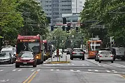 The street passes the east side of the Amazon headquarters campus, including Doppler and the Amazon Spheres,[5] and several high-rise residential buildings.[6] A set of curbside transit-only lanes begin at Virginia Street and include several streetcar stops that are shared with buses.[7] Westlake Avenue turns due north at an intersection with Denny Way, which marks the boundary of South Lake Union. The street continues north through the South Lake Union neighborhood, passing through an office and commercial district with several tech company offices.[8] After crossing Mercer Street at the north end of the neighborhood, the transit-only lanes end and the streetcar's southbound track turns east onto Valley Street near the Allen Institute for Brain Science Building and Google campus.[1][9]