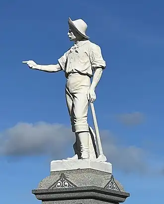 The purpose of the memorial is to commemorate the early pioneers of Westland. The term Westland refers to the West Coast and stems from the time of provincial New Zealand when the area was known as the Westland Province. A committee had formed to organise a statue and fundraise its costs. The chairman of the organising committee was Thomas Wanless Bruce, who at the time was the mayor of Ross.[5] A pound-for-pound grant was sought from the government and Francis Bell in his role as Minister of Internal Affairs approved a grant up to NZ£200.[6] The memorial was built by Thompson and Ralfe of Hokitika. The intention was to erect the memorial for the 50th jubilee of Westland[7] but the festivities were held in January 1914.[8] The memorial had been ordered by December 1913.[2]