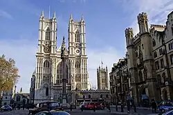 The memorial is installed on a triangular plot outside the west entrance to Westminster Abbey, and north of the gatehouse leading to Dean's Yard. It stands near where Broad Sanctuary to the north becomes Victoria Street to the west, with a short road The Sanctuary running to the south and east.