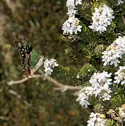 It grows to 2 metres high and has narrow leaves. These are green and glossy above and pale and hairy underneath. White flowers with red spots appear between December and February in the species' native range.[2]