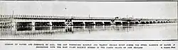 Between Napier and Westshore, Westshore bridge, No.218, spanned what was then the Tutaekuri River[34] and now known as Ahuriri Estuary, or the Main Outfall Channel.[35] It was started in 1914 for road and rail traffic, had a navigable bowstring arch of 57 feet (17 m), 10 pairs of 50 feet (15 m) reinforced concrete spans, with 25 feet (7.6 m) spans between the pairs, with expansion joints and strong longitudinal bracing. It was a joint project of PWD, Napier Harbour Board and Hawkes Bay County Council. PWD built it for £44,708 18s. and the Harbour Board built the embankments leading to the bridge,[34] completing the bank from Westshore in 1916.[36] It was 38 feet (12 m) wide,[37] with a 6 feet (1.8 m) footpath, 18 feet (5.5 m) road and 14 feet (4.3 m) railway.[38] It was 1,232 feet (376 m) long and the last concrete was poured in a ceremony on 21 January 1918.[39] The bridge was completed in March 1918, though the bank on the Napier side was still to be finished.[40] Napier Harbour Board completed the approaches to Westshore Bridge in 1923.[41]