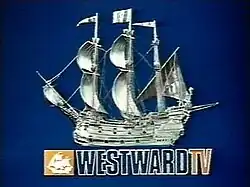 Westward Television's corporate branding focused on the sea, and mainly used a ship emblem for their on-screen look. The first ident featured an image of a boat on the water, before replacing the image with a stylised ship image in a circle, complete with Westward legend and channel nine and twelve identifiers (representing the Stockland Hill and Caradon Hill transmitters of the time), to a tune of four chimes.[12] This was replaced in the mid-1960s by a model of the Golden Hind, shot against a black background with a simple Westward caption beneath accompanied by the Holly and the Ivy tune on brass instruments.[13] This ident was altered slightly in the late 1960s to update the font to Compacta Bold.