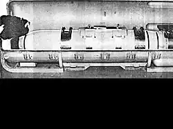 The interior of the Weteye was divided into three sections.[2] The Weteye body was composed of thin aluminum alloy. It had fins which deployed after the bomb was released.[2] The 240-kilogram Weteye held about 160 kg (350 lb) of liquid sarin nerve agent.[2]