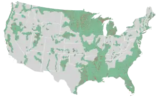 Wetlands of the United States are defined by the United States Army Corps of Engineers and the United States Environmental Protection Agency as "those areas that are inundated or saturated by surface or ground water at a frequency and duration sufficient to support, and that under normal circumstances do support, a prevalence of vegetations typically adapted for life in saturated soils. Wetlands generally include swamps, marshes, bogs, and similar areas."[1][2][3] Wetlands can be valued in terms of their contributions to ecological, economic and social systems. Wetlands service these systems through multiple processes including water filtration, water storage and biological productivity.[4] They also contribute the functions of flood control, providing a nutrient sink, groundwater recharge and habitat.[5]