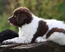 The Wetterhoun is a medium-sized dog, measuring at 55-59 centimeters (21.6-23 inches) at the withers and weighing between 25 and 35 kilos (55 and 77 pounds) at maturity. Their coat is thick and curly except for the head, ears, and legs, where it is smoother in texture; the water repellant coat is described as feeling oily to the touch. Coat colour may be solid black or brown, black and white, or brown and white, with or without ticking or roaning. The texture of the coat should not be woolly, as such hair is not water repellent. The ears are low-set and hang flat to the head, and the tail curls tightly over the back. The breed has an unusual, somewhat stern expression due to the shape of the eyes,[1] which distinguishes this breed from others.[2][3]