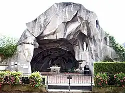 Grotte de Lourdes grandeur réelle: In 1912, after the destruction of the house of his birth by a fire, archbishop François-Xavier Schoepfer (1843–1927), bishop of Tarbes and Lourdes from 1899 until 1927, decided to let build an exact copy of the grotto Massabielle in Lourdes at the same place where the house stood. The statue of the Virgin Mary was placed on a stone coming from the site where St. Bernadette Soubirous first saw the Immaculate Conception in 1858. The cavern in the heart of the village is still hosts many religious ceremonies.
