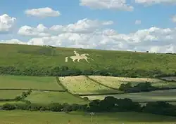 In celebration of the king's patronage, in 1810, a painted statue was placed on the seafront. Known simply as the King's Statue, it was extensively renovated in 2007–08.[2][15] A second tribute to George III, completed two years earlier in 1808, is the mounted white horse at Osmington. Designed by local architect James Hamilton, and cut into the chalk hillside by soldiers under his direction, the figure measures 280 ft (85 m) long by 323 ft (98 m) high.[16]