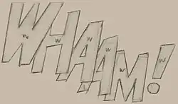 Lichtenstein altered the composition to make the image more compelling, by making the exploding plane more prominent compared to the attacking plane than in the original.[25] The smoke trail of the missile becomes a horizontal line. The flames of the explosion dominate the right panel,[25] but the pilot and the airplane in the left panel are the narrative focus.[46] They exemplify Lichtenstein's painstaking detailing of physical features such as the aircraft's cockpit.[57] The other element of the narrative content is a text balloon that contains the following text: "I pressed the fire control ... and ahead of me rockets blazed through the sky ..."[52] This is among the text believed to have been written by All-American Men of War editor Robert Kanigher.[28][58][59] The yellow word "WHAAM!", altered from the red in the original comic-book panel and white in the pencil sketch, links the yellow of the explosion below it with the textbox to the left and the flames of the missile below the attacking plane.