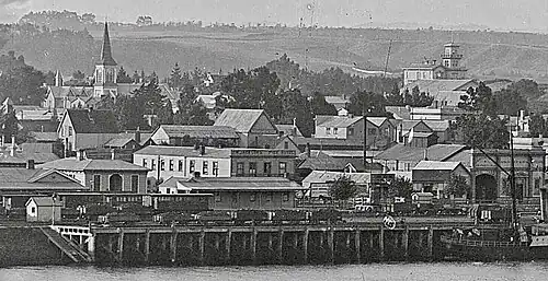 The first work on the railway was a 1 July 1875 contract with Calman & Richardson to build a wharf for £788-16s. By 26 October 1875 James Moore Edwards had built an open ended shed for two engines. By 3 November 1875 there was a store room and office and by 25 December 1875 the wharf was ready. By 1 February 1877 G M Chalmers had built a temporary station on an unused bit of Churton Street.[4] On 19 July 1877 William Rowe got a £4795.6.8 contract to build Wanganui Town Branch, which was finished by 4 November 1877. In 1877 and 1878 housing and offices for a stationmaster and public works (PWD) staff were bought and a 50-ton coal store built.[4]