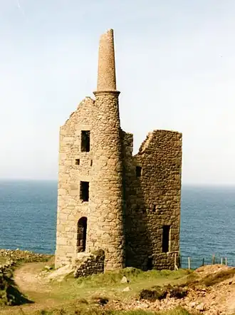 The mine was commenced by John Boyns, in circa 1830 on earlier workings, with Wheal Boys first opened, and shortly after the Growse. Water was drained from old workings by a steam engine but little ore was found and it was some years before a profit was made. In 1836, 131 people were employed there, 110 men and 21 women.[1] Driving eastwards, towards the Botallack Mine, the Cercendrey and Cargotha lodes were intersected and a large amount of tin was raised. Wheal Boys also eventually produced a large amount of tin. At one time the mine employed around 500 people and is over 200 fathoms (1,200 ft; 370 m) deep.[2] At a general meeting of the shareholders on 8 March 1884 it was decided to close the older part of the mine and to carry on mining the cliff part of the mine. Over 100 tons of ore was processed each month but due to the low price of tin the mine was making a loss.[3]