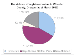 Though Wheeler County is located in central Oregon, it politically falls in line with the eastern side of the state. The majority of registered voters who are part of a political party in Wheeler County, as well as most counties in eastern Oregon, are members of the Republican Party. The county has only voted Democratic in four presidential elections following its formation.[16] The last Democrat to win a majority in the county was Jimmy Carter in 1976. No Democrat has won over 40 percent of the vote in Wheeler County since 1988, with that election having been heavily influenced by drought.