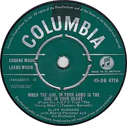 "When the Girl in Your Arms Is the Girl in Your Heart" is a 1961 hit by Cliff Richard written by the songwriting team of Sid Tepper and Roy C. Bennett who would contribute fifteen songs to the Cliff Richard canon including his career record "The Young Ones". Produced by Richard's regular producer Norrie Paramor, "When the Girl in Your Arms..." featured backing by the Norrie Paramor Orchestra. Richard's own group the Shadows backed him on the B-side "Got a Funny Feeling".[1]