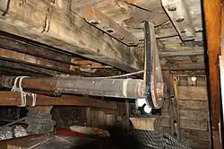In a typical arrangement, an iron gooseneck was fitted at the fore end of the tiller. Then, a metal ring was fitted over this and secured with a pin. The ring was attached to a long, thin pole (the whipstaff proper) and this pole connected the tiller to the helmsman one or more decks above it through a pivot point, roll, or rowle, described as "that round piece of wood or iron wherein the whip doth go and is made turn about that it may carry over the whip from side to side with more ease."[3]: p.173 The helmsman himself still usually did not stand on the topmost deck, but rather viewed what lay ahead of the ship through a small port or hatchway in the deck above him called a companion. To move the ship to port, the forward-facing helmsman pulled the top of the staff to his left and pushed the pole down and to the right; to move it to starboard, he pulled the top to his right and pushed the pole down and to the left. In this fashion, the tiller might get as much as 20° of turn[4] though angles of between 5° and 10° seem more likely.[5] The tiller rested on a very strong horizontal wooden bar called the tiller sweep, which was sheathed in metal and coated with soap and grease to minimize the drag of the tiller as it rode across it.