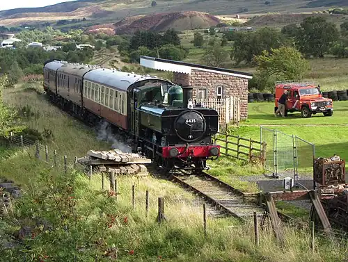 Steam workings on the Pontypool and Blaenavon commenced on 11 August 1984 and a station was opened at Whistle Inn on 30 April 1988.[8][9] Just beyond the station to the north was Garn-yr-erw Halt.[10][11] Whistle Inn, which takes its name from the adjacent public house,[12] is the line's northern terminus and its highest point at 1,307 feet (398 m) above sea level.[11]