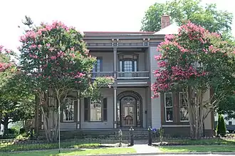 The White-Baucum House is a historic house at 201 South Izard Street in Little Rock, Arkansas. It is an L-shaped two story wood-frame house, with a hip roof extending over two stories of balconies in the crook of the L, giving the building an overall rectangular footprint. It has Italianate styling, with a bracketed and dentillated eave, spindled porch balustrades, and an elaborate front entry in a round-arch surround. Built in 1869–70, it is one of Arkansas's earliest and finest examples of high style Italianate architecture.[2]
