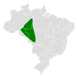 The white-breasted antbird is found in central Amazonian Brazil from the east bank of the lower Rio Madeira in Amazonas south through Rondônia into western Mato Grosso. It primarily inhabits the understorey of humid terra firme evergreen forest though it also occurs in transitional forest between it and seasonally flooded areas. Its range is entirely below 300 m (1,000 ft) of elevation.[6][7]