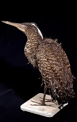 The white-crested tiger heron possesses a distinct appearance, including a slender elongated body, standing at around 66 to 80 centimeters (26 to 31 inches) tall.[2] Its plumage is relatively dull, and consists of brown, buff and rufous plumage, along with black barring. The exception to its dull plumage lies in its brilliant white crest, although not much is known about its uses. The nape along with the sides of its head and neck are light rufous with black barring, while the mantle, scapulars and rump possess rufous, buff and brown coloration, with bold black bars. Females possess a more dull coloration, including narrow buff barring and a pink cinnamon coloration on the underside.[3] The legs, along with the eye and part of the bill are yellow with black highlights. Chicks originally possess yellow down, which turns to white before molting.[2][4]