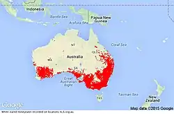| Range map of the white-eared honeyeater (Nesoptilotis leucotis) | |