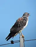 The white-tailed hawk is a large, stocky hawk. It is similar in size to the Swainson's (Buteo swainsoni) and red-tailed hawks (Buteo jamaicensis), with mean measurements slightly larger than the former and slightly smaller than the latter. It can attain a total length of 44–60 cm (17–24 in) and a wingspan of 118–143 cm (46–56 in). Body mass has been reported as 880–1,240 g (1.94–2.73 lb) (B. a. hysopodius) and 865–1,010 g (1.907–2.227 lb) (B. a. colonus). Standard measurements include a wing chord of 39–46.2 cm (15.4–18.2 in), a tail of 19.4–22 cm (7.6–8.7 in), and a tarsus of 8–9.2 cm (3.1–3.6 in).[4] Adult birds are grey above and white below and on the rump, with faint pale grey or rufous barring. The short tail is white with a narrow black band near the end that is conspicuous in flight. A rusty-red shoulder patch is also characteristic when the bird is perched with wings closed. The upperwings are dark, mixed with grey near the bases of the blackish primary remiges. The underwing is whitish, with indistinct brownish barring on the underwing coverts; this barring extends onto the flanks and thighs. The iris is hazel, the cere is pale green, the beak is black with a horn-colored base, and the feet are yellow with black talons.[5]