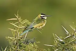 The white-throated bee-eater is a bird which breeds in dry sandy open country, such thorn scrub and near-desert. These abundant bee-eaters are gregarious, nesting colonially in sandy banks or open flat areas. They make a relatively long 1–2 m tunnel in which the 6 to 7 spherical white eggs are laid. Both the male and the female take care of the eggs, but up to five helpers also assist with caring for the young.