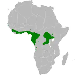 The white-throated greenbul was formally described and illustrated in 1882 by the English ornithologist Richard Bowdler Sharpe based on a specimen collected in the Fantee region of central Ghana. He coined the binomial name Xenocichla albigularis.[2][3] It is now one of 21 species placed in the genus Phyllastrephus that was introduced in 1832 by the English naturalist William Swainson.[4] The genus name combines Ancient Greek φυλλον/phullon meaning "leaf" with στρεφω/strephō meaning "to toss" or "to turn".[5] The specific epithet albigularis combines Latin albus meaning "white" with Modern Latin gularis meaning "throated".[6] The Angola greenbul was formally considered to be a subspecies. The white-throated greenbul is now monophyletic: no subspecies are recognised.[4]