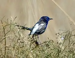 Ironically, the original specimen was of the black-plumaged subspecies from Dirk Hartog Island, which was not recorded again for 80 years. Meanwhile, the widespread blue-plumaged subspecies was discovered and described as two separate species by John Gould in 1865.[3] He called one specimen collected from inland New South Wales the white-winged superb warbler (M. cyanotus), while another, which appeared to have a white back and wings, was described as the white-backed superb warbler (M. leuconotus). It was not until the early 20th century that both of these blue-plumaged mainland forms were found to be of a single species.[5] George Mack, ornithologist of the National Museum of Victoria, considered the specific name leuconotus to take precedence in his 1934 revision of the genus,[6] and more recent studies have followed suit.[7] The back region between the shoulders is in fact bare, with feathers that arise from the shoulder (scapular) region and sweep inwards in different patterns. This variation confused the early naturalists who described the white-backed and blue-backed species.[3]
