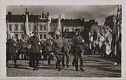 The movement soon established itself as a main contributor of the various irridentist campaigns,[8] transforming from a temporary and "hastily organized" organization into one consisting of over 100,000 guardsmen with units in almost every Finnish municipality. This new White Guard outnumbered the totality of the civil war time White Army.[9] Supporters of the re-established movement included the Regent of Finland Carl Gustaf Emil Mannerheim, who had led the White Army during the civil war.[9] According to historians Pekka Hallberg and Tuomo Martikainen, the White Guards soon became "a bourgeois armed force that threatened the democratic system" and "hindered the exercise of power by the parliament and the government."[7]
