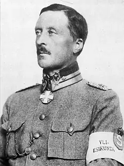 Even after the civil war had ended in Finland proper, the conflict continued in bordering Russian territories in the form of the Heimosodat, where more than 10,000 Finnish White volunteers conducted multiple "irridentist" and "semi-official military campaigns" starting from 1918.[5] According to Aapo Roselius, these events stemmed in part from the failure of the Whites to properly demobilize, which had resulted in the re-establishment of the Civil Guard only half a year after the end of the Civil War as a movement which "saw itself as the successor to the White Army and as guardian of the White victory of 1918".[6] The White Guard was given an official status in 1919, after which the president of the republic was the commander-in-chief of the White Guard.[7]