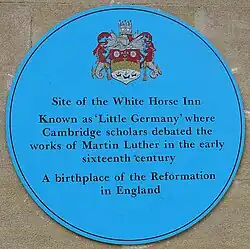 The White Horse Tavern or White Horse Inn[1] was allegedly the meeting place in Cambridge for English Protestant reformers to discuss Lutheran ideas, from 1521 onwards.[2] According to the historian Geoffrey Elton the group of university dons who met there were nicknamed "Little Germany"[3] in reference to their discussions of Luther. Whilst the pub undoubtedly existed, several scholars have questioned the existence of the White Horse meetings – they are described by John Foxe in his Book of Martyrs, but no other evidence for them exists.[4][5][6][7] Gergely M Juhász writes that "Foxe’s romantic image of these students and scholars convening secretly on a regular basis in the White Horse Inn… is unsubstantiated", and Alec Ryrie refers to it as "the stubborn legend of the White Horse Inn".[4][6]