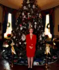 | 2013 | Douglas fir, Lehighton, Pennsylvania[59][60] | Ornaments paid tribute to military families. Children living on military bases contributed greeting cards in the shape of their home state. Those were hung from the tree along with round ornaments that silhouetted each state and territory.[61] | Michelle Obama | Blue Room | Gather Around: Stories of the Season[62] | |