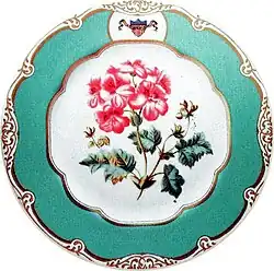 The White House needed a new china service when the Polks took up residence in 1845. The same company which produced the Monroe china service, Dagoty-Honoré of Paris, made their state dinner service. The dinner and dessert services were ordered in 1846; 400 pieces cost US$979.40. The service included a plain white design and gold trim, making it popular with later administrations. The simplicity of the china made it well-suited to mix with other depleted services when the occasion arose.[1] The dessert service, rather than being plain, features a soft green border and polychrome flowers.