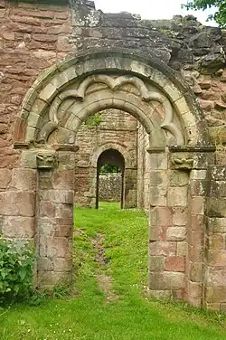 The church building was a simple cruciform, sandstone structure, with a nave of five bays, and a chancel of three bays. The transepts were small and without chapels.[50] Today, the lay-out of the building is still easy to discern, although little remains of either transept, and only the north wall of the nave and chancel is fairly intact.[16] There is a fine, round-headed Romanesque arch leading into the north transept, through which the residents would have passed to reach the cloister and the monastery. The windows on the north side are largely intact, making it easy to identify the bays of both nave and chancel. The south wall would have been windowed in the same way. It seems that the stone for the church was obtained locally – perhaps even in a field adjacent to the site, as one of the fish ponds seems to have been created from a quarry scoop.[1]