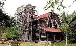 The "Castle" is a sturdy log house which stands 3 storys tall (8.8 metres, 29 ft), with a square tower extending up an additional floor (12 metres, 41 ft). The main part of the building measures 7.3 by 8.5 metres (24 by 28 ft), while an attached kitchen area adds a further 4.3 by 6.1 metres (14 by 20 ft) to the floorplan. It has 26 windows.[4]