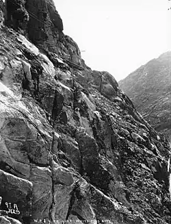 The White Pass was closely controlled by the Chilkoot Indians and was unknown to non-natives until 1887. While in Juneau, William Ogilvie had heard reports of a low pass near the Deyes Inlet to the headwaters of the Lewes River (Yukon River). The Ogilvie expedition was on its way to the Yukon territory in order to survey and mark the international boundary on the Yukon River. In June 1887, Ogilvie's expedition was at the head of Taiya Inlet doing a survey from Pyramid Island up through the Chilkoot Pass. William Moore, who had travelled up from Juneau on the steamer, had experience building roads in mountainous areas and wanted to try this route since the Chilkoot Pass was reported to be too steep for a wagon road. They had heard rumors about another lower pass that the Chilkoot Indians controlled. Ogilvie made inquiries and learned there was such a pass. An Indian named Jim, after much talk and encouragement, was persuaded to reveal it. Moore and his guide went over this low altitude pass. Ogilvie and his surveying party ascended the Chilkoot Pass. Among the many Chilkoot Indians hired to carry their supplies up the pass was Skookum Jim Mason, who, with his family, discovered the rich gold deposits in the Klondike.[1] Moore did a rough survey of the new pass and returned with the satisfaction that he had found the route for his wagon road. The White Pass was named for the Canadian Minister of the Interior Thomas White by William Ogilvie.[2]