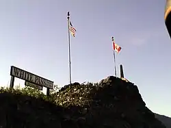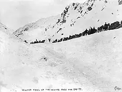 The White Pass was closely controlled by the Chilkoot Indians and was unknown to non-natives until 1887. While in Juneau, William Ogilvie had heard reports of a low pass near the Deyes Inlet to the headwaters of the Lewes River (Yukon River). The Ogilvie expedition was on its way to the Yukon territory in order to survey and mark the international boundary on the Yukon River. In June 1887, Ogilvie's expedition was at the head of Taiya Inlet doing a survey from Pyramid Island up through the Chilkoot Pass. William Moore, who had travelled up from Juneau on the steamer, had experience building roads in mountainous areas and wanted to try this route since the Chilkoot Pass was reported to be too steep for a wagon road. They had heard rumors about another lower pass that the Chilkoot Indians controlled. Ogilvie made inquiries and learned there was such a pass. An Indian named Jim, after much talk and encouragement, was persuaded to reveal it. Moore and his guide went over this low altitude pass. Ogilvie and his surveying party ascended the Chilkoot Pass. Among the many Chilkoot Indians hired to carry their supplies up the pass was Skookum Jim Mason, who, with his family, discovered the rich gold deposits in the Klondike.[1] Moore did a rough survey of the new pass and returned with the satisfaction that he had found the route for his wagon road. The White Pass was named for the Canadian Minister of the Interior Thomas White by William Ogilvie.[2]